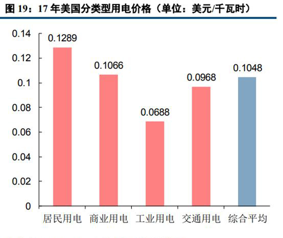 從2017年分類型用電價(jià)格的數(shù)據(jù)來(lái)看,中美電價(jià)水平整體較為接近,但美國(guó)居民用電價(jià)格大幅高于中國(guó)。我國(guó)一般工商業(yè)的平均用電電價(jià)較高,為0.76524元/千瓦時(shí),大工業(yè)和居民用電的平均電價(jià)分別為0.59785元/千瓦時(shí)和0.52894元/千瓦時(shí)。而美國(guó)平均用電價(jià)格最高的用戶類型為居民用電,為0.1289美元/千瓦時(shí),商業(yè)用電、交通用電和工業(yè)的平均電價(jià)則相對(duì)較低,分別為0.1066、0.0968和0.0688美元/千瓦時(shí)(數(shù)據(jù)來(lái)自于EIA,各地州政府或有少量稅費(fèi))。