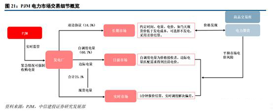 事實(shí)上PJM整合了PX(電力交易商)和獨(dú)立系統(tǒng)運(yùn)營(yíng)商(ISO)的角色,采用著名的節(jié)點(diǎn)邊際價(jià)格LMP來(lái)制定電力市場(chǎng)化交易價(jià)格。從交易品種來(lái)劃分,PJM包括電量市場(chǎng)、容量市場(chǎng)、輔助服務(wù)市場(chǎng)和金融輸電權(quán)市場(chǎng);從交易時(shí)限來(lái)劃分,可以分為長(zhǎng)期市場(chǎng)、日前市場(chǎng)和實(shí)時(shí)市場(chǎng)(現(xiàn)貨交易)。需要注意的是,PJM自身不提供電力期貨交易,主要是相關(guān)商品交易所(紐約商業(yè)交易所、洲際交易所)等將非標(biāo)準(zhǔn)化的場(chǎng)外交易合約按照期貨交易機(jī)制進(jìn)行標(biāo)準(zhǔn)化改造,推出電力期貨合約。目前,美國(guó)、歐洲和澳大利亞均有區(qū)域性電力期貨交易上市。