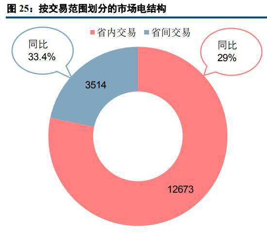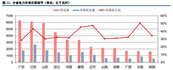從分省電力市場(chǎng)交易細(xì)節(jié)來(lái)看,市場(chǎng)交易電量占全社會(huì)用電量比重較高省份主要有云南(50.7%)、遼寧(47.6%)、蒙西(45.3%)和江蘇(43.4%)。市場(chǎng)電量絕對(duì)值較高的省份包括江蘇(2657億千瓦時(shí))、廣東(1805億千瓦時(shí))、山東(1783億千瓦時(shí))、浙江(1470億千瓦時(shí))、蒙西(1256億千瓦時(shí))、遼寧(1097億千瓦時(shí))和河南(1080億千瓦時(shí))。