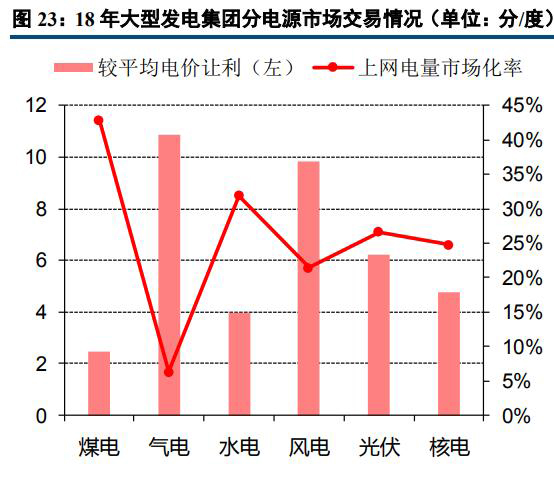2018年大型發(fā)電集團(tuán)上網(wǎng)電量合計(jì)36587億千瓦時(shí),同比增長(zhǎng)11%;其市場(chǎng)交易電量合計(jì)13713億千瓦時(shí)(不含發(fā)電權(quán)交易),同比增長(zhǎng)26.4%,占大型發(fā)電集團(tuán)合計(jì)上網(wǎng)電量的37.5%,較上年提高4.5個(gè)百分點(diǎn)。從分電源情況來(lái)看,煤電機(jī)組上網(wǎng)電量市場(chǎng)化率最高,達(dá)42.8%,市場(chǎng)電較平均電價(jià)讓利為2.45分/千瓦時(shí);水電上網(wǎng)電量市場(chǎng)化率排名第二,達(dá)31.9%,市場(chǎng)電較平均電價(jià)讓利為3.96分/千瓦時(shí)。風(fēng)電、氣電等電源市場(chǎng)化率相對(duì)較低,對(duì)應(yīng)度電讓利較高。