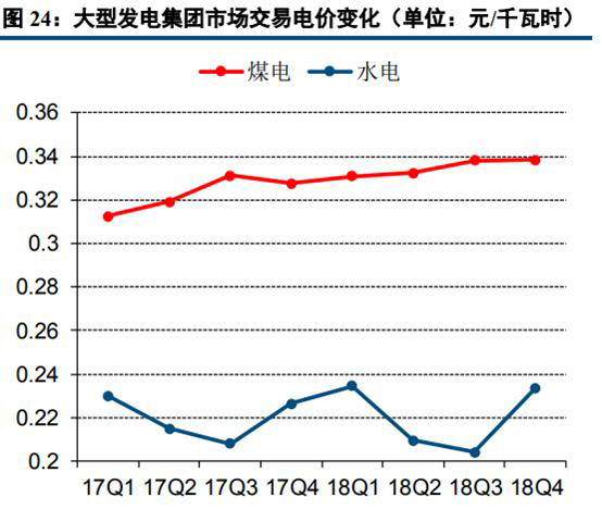 從大型發(fā)電集團(tuán)的市場(chǎng)化交易電價(jià)變化趨勢(shì)來(lái)看,煤電及水電的交易電價(jià)整體趨勢(shì)向上。大型發(fā)電集團(tuán)2018年煤電市場(chǎng)交易(含跨區(qū)跨省市場(chǎng)交易)平均電價(jià)為0.3383元/千瓦時(shí),較上年提高0.0119元/千瓦時(shí);水電機(jī)組市場(chǎng)交易平均電價(jià)為0.2245元/千瓦時(shí),較上年提高0.0038元/千瓦時(shí)。