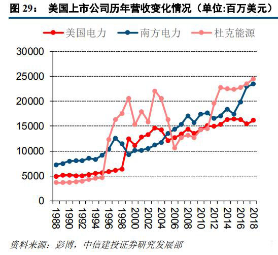 從市凈率角度來(lái)看,美國(guó)電力等三家美國(guó)公司的PB估值也有所提升,但增長(zhǎng)節(jié)奏與PE有所出入。我們將時(shí)間劃分為1991年~2001年、2001年~2011年及2011~2019年三個(gè)區(qū)間,美國(guó)電力、南方電力和杜克能源的平均PB分別為1.58/1.11/1.25、1.49/2.15/1.00、1.62/2.05/1.29。南方電力的PB估值在2001后有所躍升,而美國(guó)電力及杜克能源增長(zhǎng)相對(duì)不太明顯。