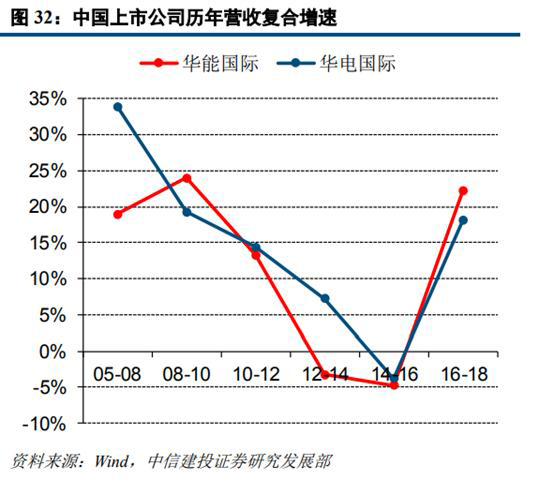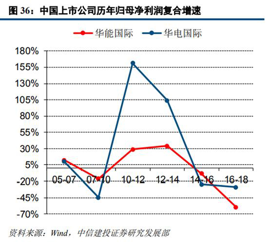 從營(yíng)收復(fù)合增速來(lái)看,從2005年至2016年華能國(guó)際與華電國(guó)際的營(yíng)收復(fù)合增速均處于下降通道。我們判斷主要是受我國(guó)發(fā)用電增速下臺(tái)階以及基數(shù)效應(yīng)影響所致。2016-2018年兩公司營(yíng)收復(fù)合增速觸底回升,主要受用電需求回暖、2017年7月份部分省份上調(diào)燃煤標(biāo)桿電價(jià)、新機(jī)組投產(chǎn)及資產(chǎn)注入等因素影響。