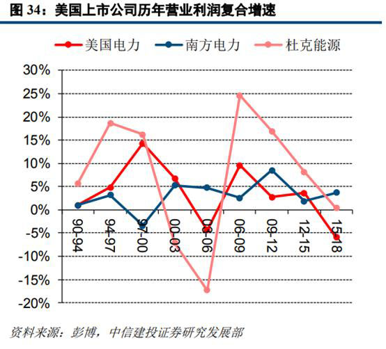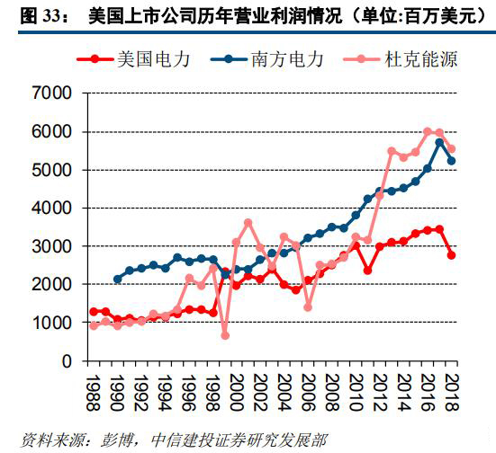 從美國(guó)上市公司的盈利情況來(lái)看,雖然年際間營(yíng)業(yè)利潤(rùn)情況有所波動(dòng),但整體仍保持穩(wěn)健提升的趨勢(shì)。自2011年之后,相關(guān)企業(yè)營(yíng)業(yè)利潤(rùn)及增速保持相對(duì)平穩(wěn),波動(dòng)幅度較之前的年份有所收窄。在前面我們對(duì)于美國(guó)電力市場(chǎng)化進(jìn)程及機(jī)制的分析中也可以看到,以PJM為代表的一系列區(qū)域輸電組織已形成了相對(duì)完備的電力市場(chǎng)化交易機(jī)制,通過長(zhǎng)期合約、期貨、現(xiàn)貨等一系列交易手段,電力的商品屬性及真實(shí)價(jià)格得到充分體現(xiàn)。發(fā)電企業(yè)可以依據(jù)電力供需格局及能源價(jià)格,合理調(diào)整發(fā)電側(cè)報(bào)價(jià),在一定程度上可以轉(zhuǎn)移燃料成本波動(dòng)對(duì)于自身盈利能力的沖擊影響。