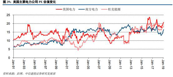 從美國(guó)電力等三家公司近三十年的PE估值水平來(lái)看,其估值波動(dòng)區(qū)間主要在10-20倍之間且呈現(xiàn)震蕩上行趨勢(shì)。我們將時(shí)間劃分為1991年-2001年、2001年-2011年及2011-2019年三個(gè)區(qū)間,美國(guó)電力、南方電力和杜克能源的平均PE分別為13.6/8.71/9.09、12.67/15.47/11.24、16.15/16.43/15.83,市盈率估值穩(wěn)步提升的趨勢(shì)較為明顯。