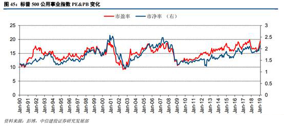 為了剔除公司層面偶然事件的影響,我們進(jìn)一步對(duì)比中美電力行業(yè)指數(shù)的估值情況。我們選擇標(biāo)普500的公用事業(yè)指數(shù)和中信火電行業(yè)指數(shù)進(jìn)行對(duì)比分析。從標(biāo)普500公用事業(yè)指數(shù)來(lái)看,其PE及PB波動(dòng)幅度較為一致,說明此指數(shù)相應(yīng)的ROE也較為穩(wěn)定,基本上在8%—10%之間。2015年后指數(shù)的估值中樞有所上移,PE及PB的中位數(shù)分別為17.26倍和1.89倍。