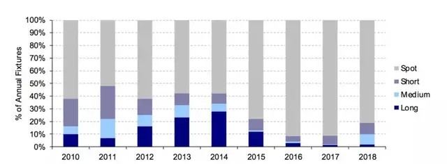 隨著LNG貿(mào)易變得更加流動和多樣化,LNG運輸所有權(quán)的歸屬也在發(fā)生變化。貿(mào)易商和電力公用事業(yè)等更多參與者開始成為船東,長期LNG合同比例的下降,迫使傳統(tǒng)船東尋找共同投資者。