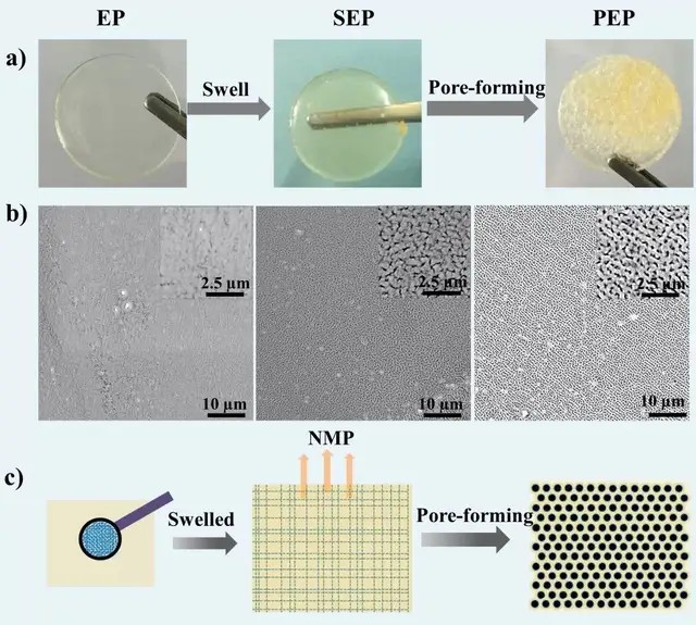 圖2 EP, SEP和PEP的光學(xué)(a)和SEM(b)圖片及多孔PEP形成示意圖(c)