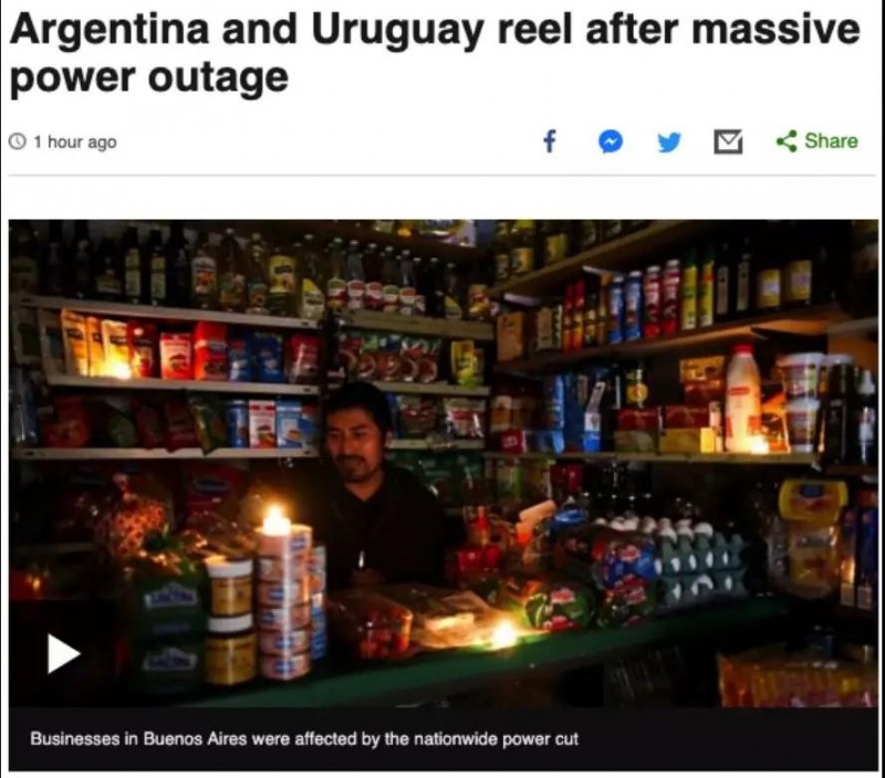 就在昨天,阿根廷人就經(jīng)歷了這樣的事……這片278萬(wàn)平方公里的遼闊國(guó)土(面積約為日本的7倍),除了最靠近南極的那片“離島”以外,竟然全境斷電。不僅如此,周邊鄰居烏拉圭和巴拉圭也受到了影響。