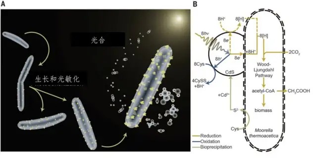 擁有這個途徑的一種微生物叫做熱醋穆爾氏菌(Moorella thermoacetica),這種微生物同時還能夠?qū)⒁环N半導體材料硫化鎘沉積到自己的表面,這樣以來固碳和捕光的對象就都有了,把它們倆組合也是順利成章的事了。
