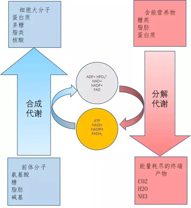 生物體內(nèi)的代謝網(wǎng)絡(luò)是很復雜的,簡單來看可以分成合成代謝和分解代謝,合成代謝是將相對比較簡單的代謝物轉(zhuǎn)化為細胞大分子的過程,這個過程需要能量(ATP)和還原力(NADH,NADPH,F(xiàn)ADH2等),而分解代謝是將細胞內(nèi)的含能營養(yǎng)物轉(zhuǎn)化成幾種基本化合物的過程,這個過程會為細胞提供能量和還原力。