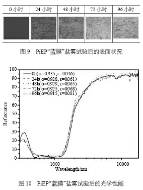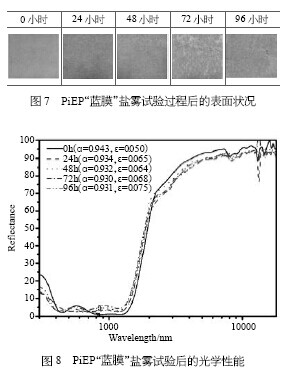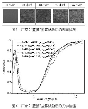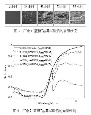 鹽霧試驗(yàn)是考察涂層的耐腐蝕能力,一般是將其放在潮濕、有腐蝕介質(zhì)的環(huán)境中觀測其腐蝕發(fā)生的程度。鹽霧試驗(yàn)后,涂層吸收比和發(fā)射比的變化反映出涂層的耐候性能。