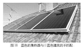 平板太陽能集熱器主要應(yīng)用于建筑方面,即需要與建筑相結(jié)合。而建筑會(huì)有不同的顏色,若建筑與集熱器的顏色相差太大,則可能出現(xiàn)外觀上的不兼容,出現(xiàn)如圖11 所示的不協(xié)調(diào),則可能影響建筑設(shè)計(jì)師在設(shè)計(jì)過程中放棄太陽能集熱器。我們需要多種色彩的吸熱涂層和邊框,使平板太陽能集熱器與建筑更加完美的結(jié)合。