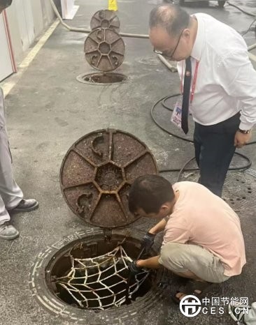 (圖為賴國良正在排查排水系統(tǒng)問題,右一為賴國良)