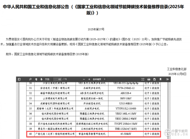 近期,《國(guó)家工業(yè)和信息化領(lǐng)域節(jié)能降碳技術(shù)裝備推薦目錄(2025年版)》公布,廣能億能(北京)核能科技有限公司的“常溫半超導(dǎo)智慧節(jié)能電機(jī)”,憑借出色的產(chǎn)品性能和優(yōu)于國(guó)家1級(jí)能效的優(yōu)勢(shì)成功入選該目錄。