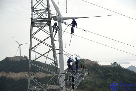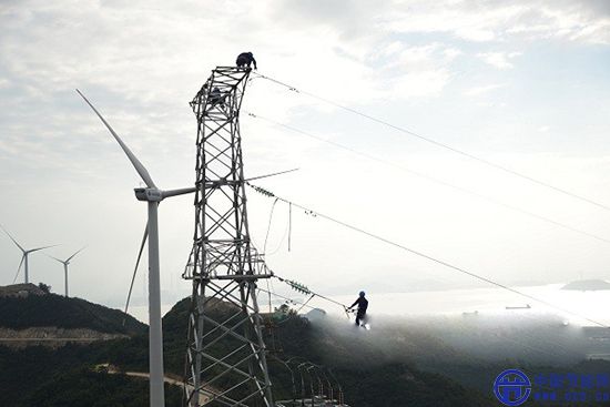 9月16日下午,舟山電力工人在金塘風(fēng)電場輸出電力架空線路(35kv大塘3573線)7號塔上進(jìn)行最后驗收。該線路起自金塘風(fēng)電場升壓站,經(jīng)7基鐵塔、1700米架空輸電線路及2000米電纜,與國網(wǎng)110kv大豐變電站聯(lián)接,是金塘風(fēng)電場綠色能源輸出的主動脈。