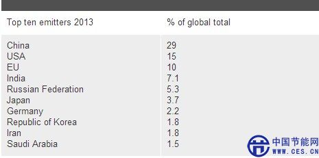 據(jù)英國(guó)廣播公司21日?qǐng)?bào)道,相關(guān)數(shù)據(jù)由“全球碳計(jì)劃”發(fā)布。“全球碳計(jì)劃”是一個(gè)擁有13年歷史的氣候變化研究人員合作組織,其科學(xué)家來(lái)自世界不同研究機(jī)構(gòu),每年對(duì)各國(guó)碳排放量發(fā)布客觀數(shù)據(jù)。根據(jù)其發(fā)布的最新數(shù)據(jù),2013年人類碳排放量達(dá)360億噸。其中排名前五位的國(guó)家分別為中國(guó)29%,美國(guó)15%,歐盟10%,印度7.1,俄羅斯5.3 %。單從這一年看,中國(guó)的碳排放總量超越了美歐總和。