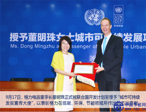 2014年9月17日,聯(lián)合國授予格力電器董事長董明珠“城市可持續(xù)發(fā)展宣傳大使”證書,以表彰她帶領(lǐng)格力電器長期以來在技術(shù)創(chuàng)新、提高能源效率和緩和環(huán)境惡化方面做出的不懈努力與貢獻(xiàn),使得格力成為全球可持續(xù)發(fā)展的領(lǐng)軍力量,在創(chuàng)新性研究及發(fā)展領(lǐng)域完成諸多“不可能的任務(wù)”,包括世界首臺自主研發(fā)的光伏直驅(qū)變頻離心機和R290環(huán)保冷媒的應(yīng)用。格力光伏直驅(qū)變頻離心機系統(tǒng)集成了太陽能光伏發(fā)電、中央空調(diào)、發(fā)電及用電管理系統(tǒng),實現(xiàn)了中央空調(diào)能源自給自足、不用電費,開創(chuàng)了中央空調(diào)的零能耗時代。自主研發(fā)的R290環(huán)保冷媒技術(shù),使空調(diào)徹底擺脫了對“氟利昂”的依賴,表明中國企業(yè)在新冷媒技術(shù)的研究和應(yīng)用上首次走到國際前沿。