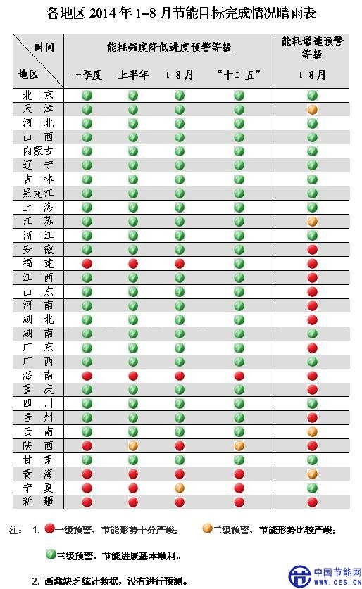 近日,國家發(fā)布了各地區(qū)2014年1-8月節(jié)能目標(biāo)完成情況晴雨表。通過對各地區(qū)節(jié)能形勢進行分析,對照各地“十二五”年均節(jié)能任務(wù),1-8月,福建、海南、陜西、青海、新疆等5個地區(qū)預(yù)警等級為一級,節(jié)能形勢十分嚴(yán)峻;寧夏預(yù)警等級為二級,節(jié)能形勢比較嚴(yán)峻;北京、天津、河北、山西、內(nèi)蒙古、遼寧、吉林、黑龍江、上海、江蘇、浙江、安徽、江西、山東、河南、湖北、湖南、廣東、廣西、重慶、四川、貴州、云南、甘肅等24個地區(qū)預(yù)警等級為三級,節(jié)能工作進展基本順利。西藏缺乏統(tǒng)計數(shù)據(jù),沒有進行預(yù)測。與上半年相比,陜西由二級預(yù)警上升為一級預(yù)警,寧夏由一級預(yù)警下降為二級預(yù)警。