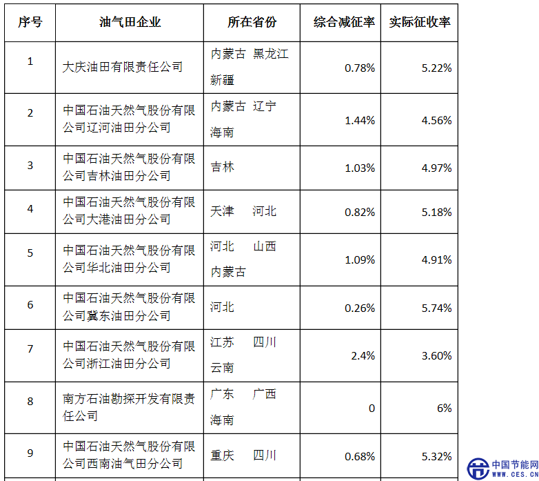 中國(guó)石油天然氣集團(tuán)公司和中國(guó)石油化工集團(tuán)公司(以下簡(jiǎn)稱中石油、中石化)陸上油氣田企業(yè)的綜合減征率和實(shí)際征收率由財(cái)政部和國(guó)家稅務(wù)總局確定,具體綜合減征率和實(shí)際征收率按本通知所附《陸上油氣田企業(yè)原油、天然氣資源稅綜合減征率和實(shí)際征收率表》(以下簡(jiǎn)稱附表)執(zhí)行。今后財(cái)政部和國(guó)家稅務(wù)總局將根據(jù)陸上油氣田企業(yè)原油、天然氣資源狀況、產(chǎn)品結(jié)構(gòu)的實(shí)際變化等情況對(duì)附表內(nèi)容進(jìn)行調(diào)整。附表中未列舉的中石油、中石化陸上對(duì)外合作油氣田及全資和控股陸上油氣田企業(yè),比照附表中所列同一區(qū)域油氣田企業(yè)的綜合減征率和實(shí)際征收率執(zhí)行;其他陸上油氣田企業(yè)的綜合減征率和實(shí)際征收率,暫比照附表中鄰近油氣田企業(yè)的綜合減征率和實(shí)際征收率執(zhí)行。