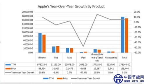 大多數(shù)蘋果公司的配件產(chǎn)品線都被認為是馬后炮,如數(shù)據(jù)線、耳機和無線鍵盤。但是隨著過去四季度蘋果高端產(chǎn)品的增速整體放緩,而配件產(chǎn)品業(yè)務卻迅速漲至近60億美元,這意味著蘋果開始認真的對待配件生產(chǎn)。而下面的圖表能夠讓大家有所了解: