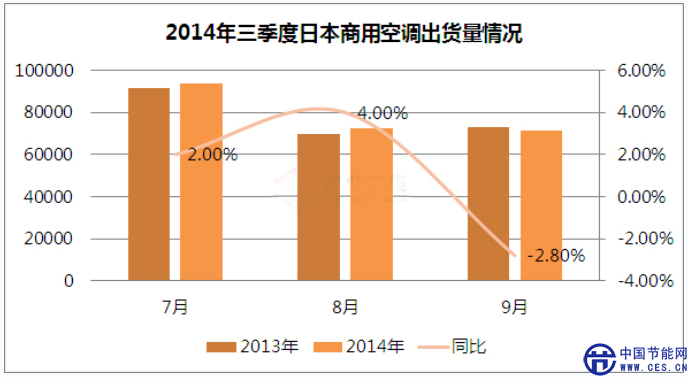 據(jù)日本制冷和空調(diào)工業(yè)協(xié)會(JRAIA)統(tǒng)計(jì)數(shù)據(jù)顯示,2014年9月日本商用空調(diào)出貨量同比環(huán)比雙雙下滑。據(jù)統(tǒng)計(jì),2014年9月日本商用空調(diào)出貨量為71162臺,與去年同期相比下滑2.80%。而與2014年8月日本商用空調(diào)出貨量72663臺相比,也同樣出現(xiàn)了下滑現(xiàn)象,環(huán)比下降2.07%。 詳見下圖。