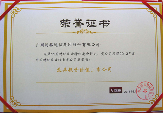 海格通信榮獲第十一屆中國財經風云榜最具投資價值上市公司