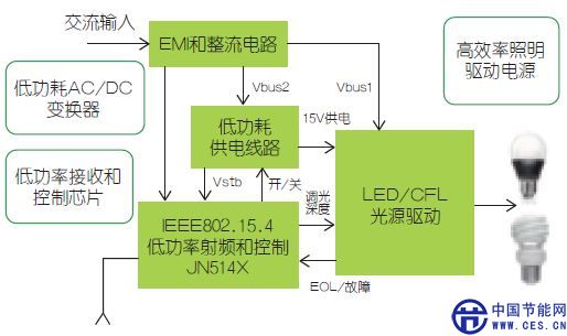 作為照明領(lǐng)域的主要芯片供應(yīng)商之一,恩智浦半導(dǎo)體早在幾年前就已經(jīng)注意到照明系統(tǒng)的智能化發(fā)展趨勢。通過整合包括光源驅(qū)動、低功耗電源、無線射頻和MCU相關(guān)產(chǎn)品線的技術(shù)優(yōu)勢,恩智浦提出以JN514X為核心的第一代智能照明系統(tǒng)解決方案,如圖2所示。得益于半導(dǎo)體集成工藝上的優(yōu)勢,具備智能控制功能的驅(qū)動電源與傳統(tǒng)驅(qū)動電源相比,尺寸沒有顯著增加,完全可以滿足諸如LED球泡燈或節(jié)能燈狹小的驅(qū)動電源空間的要求。