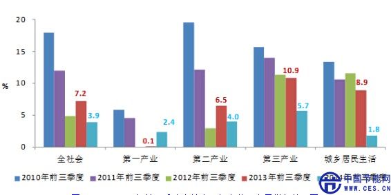 圖12010-2014年前三季度全社會(huì)及各產(chǎn)業(yè)用電量增長情況圖