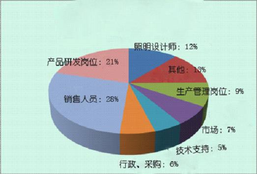 銷售崗位:28%   產(chǎn)品研發(fā)崗位:21% 照明設(shè)計師:12% 生產(chǎn)管理:9%