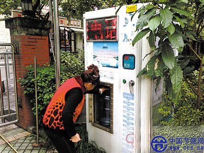 本周一,記者來到青青佳苑小區(qū),看到仍有業(yè)主提著水桶,到大門處的飲水機(jī)刷卡接水(如圖),飲水機(jī)顯得比較破舊。
