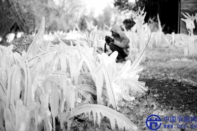 綠化帶變成一片“冰的世界”。