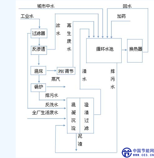 城市中水、反滲透濃水、過(guò)濾器反沖洗水、鍋爐排污水、軟化再生水、企業(yè)生活廢水、循環(huán)水系統(tǒng)排污水、蒸汽冷凝水等廢水零排放工藝路線如下圖: