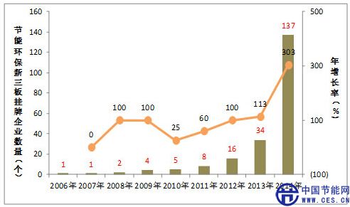 新三板上市熱潮也在節(jié)能環(huán)保領(lǐng)域得以體現(xiàn),在數(shù)量和增長速度方面表現(xiàn)不俗。據(jù)E20研究院不完全統(tǒng)計(jì),在公司數(shù)量方面,2013年末,節(jié)能環(huán)保企業(yè)登陸新三板(包含節(jié)能減排、生態(tài)保護(hù)、環(huán)境治理、公用事業(yè)等領(lǐng)域)僅為34家,而在2014年末,已增至137家,占新三板全部公司的8.9%,包括北京中標(biāo)節(jié)能、湖北金科環(huán)保、北京中持檢測、湖北川東環(huán)能、江蘇凌志環(huán)保、東莞百大能源等公司。在增長速度方面,2014年節(jié)能環(huán)保領(lǐng)域新增掛牌公司103家,而在2013年,僅新增18家。與2013年相比,2014年節(jié)能環(huán)保掛牌企業(yè)數(shù)量增長達(dá)3倍之多,增幅明顯。