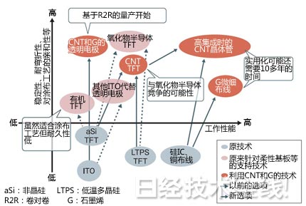 透明導電膜和傳感器今后需要在柔性薄膜上利用制造成本低的印刷技術制造。在這方面也是CNT和石墨烯占優(yōu)勢。因為其與印刷技術的親和性較高。