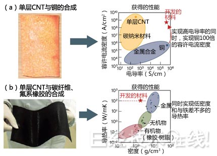 本圖為日本NEDO的項目取得的成果示例。單層CNT與銅的復合化,制成了同時具備此前無法兼顧的高容許電流密度和高電導率的材料(a)。單層CNT與碳纖維和氟系橡膠的復合化,實現(xiàn)了密度低但導熱率與鐵相當?shù)牟牧希╞)。