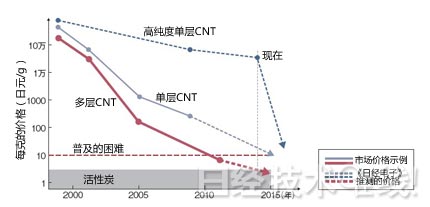 本圖為《日經(jīng)電子》推測的量產(chǎn)后的CNT價格走勢。
