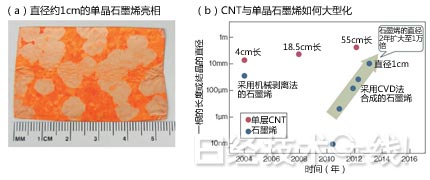 本圖為美國德州大學奧斯汀分校Ruoff研究室開發(fā)的直徑約1cm的單晶石墨烯(a),以及此前CNT和單晶石墨烯增長和擴大的過程(b)。CNT和石墨烯實現(xiàn)米級均為期不遠。