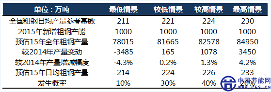 圖表 1 四種環(huán)保影響程度不同情景下的2015年粗鋼產(chǎn)量預(yù)估 (數(shù)據(jù)來(lái)源:MRI)