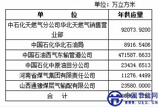 核心提示:2014年,全省天然氣年供應(yīng)量為63.09億立方米,其中,中國石油西氣東輸管道公司年供應(yīng)量為47.16億立方米,占全省天然氣年供應(yīng)量的74.75%;中石化天然氣分公司華北天然氣銷售營業(yè)部年供應(yīng)量為9.21億立方米,