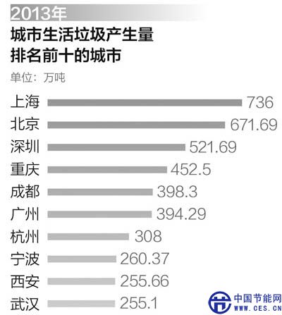 環(huán)境保護部發(fā)布《2014年全國大、中城市固體廢物污染環(huán)境防治年報》顯示:大、中城市生活垃圾產(chǎn)生總量為16148.81萬噸,處置量為15730.65萬噸,處置率為97.41%。城市生活垃圾產(chǎn)生量最大的是上海市,產(chǎn)生量為736萬噸。前10位城市產(chǎn)生的生活垃圾總量為4253.60萬噸,占全部發(fā)布的城市生活垃圾產(chǎn)生量的26.34%。