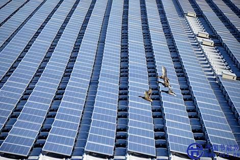 日本埼玉縣桶川市,圖為在當(dāng)?shù)厮畮靸?nèi)建設(shè)完成的水上太陽能發(fā)電站。12400平方米的水面上漂浮著4500塊太陽能電池板,而水面面積達3萬平方米的水庫及其周邊河流充足的水源也擁有良好的冷卻效果。