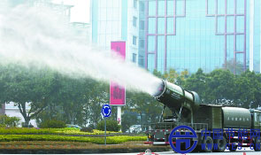 “霧炮”的原理是這樣的:液泵噴水后,利用風(fēng)機(jī)將水噴灑出去,形成水霧。噴射的水霧顆粒達(dá)到微米級,對懸浮在空氣中的粉塵顆粒進(jìn)行有效吸附,使灰塵、粉塵、污染顆粒物受重力作用沉降,從而達(dá)到抑塵作用,能減低空氣中的PM2.5濃度,其效果類似于微型人工降雨。這種車一般能裝10噸水,供霧炮噴射75分鐘左右。