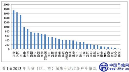 2013年各省(區(qū)、市)城市生活垃圾產(chǎn)生情況。資料來(lái)源:2014年全國(guó)大、中城市固體廢物污染環(huán)境防治年報(bào)