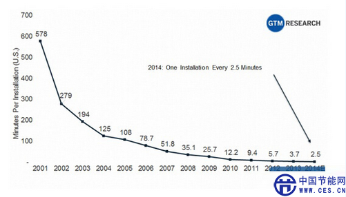 近日,美國市場研究機(jī)構(gòu)GTM Research最新報告指出,近年來美國光伏市場成長快速。2013年平均每3.7分鐘安裝一組光伏系統(tǒng),而2014年則成長到平均每2.5分鐘,就完成一組光伏系統(tǒng)的安裝,裝機(jī)整體投資額相當(dāng)于15億美元。