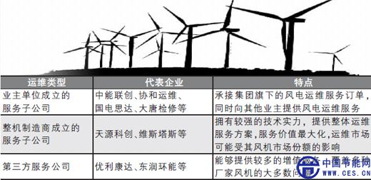 2014年風(fēng)電運(yùn)維市場蓬勃發(fā)展,國內(nèi)風(fēng)電市場逐步形成三足鼎立的局勢,一種是業(yè)主單位成立、專門負(fù)責(zé)服務(wù)的子公司,如中能聯(lián)創(chuàng)和協(xié)和運(yùn)維;第二種隸屬于整機(jī)制造商,如天源科創(chuàng);第三種,則是獨(dú)立的第三方服務(wù)公司,如東潤環(huán)能等。