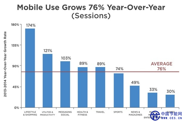 在移動互聯(lián)網迅速普及的當下,移動應用的使用量自然不斷攀升。國外的統(tǒng)計表明,2014年全球移動應用的使用量增長了76%,具體分行業(yè)不同。