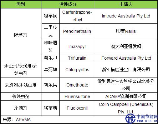 澳大利亞農(nóng)藥和獸藥管理局2015年1月13日公布了8種農(nóng)藥活性成分的登記,其中包括1個(gè)殺菌劑,4個(gè)除草劑,1個(gè)殺線蟲劑、1個(gè)殺蟲劑/殺螨劑/殺線蟲劑和1個(gè)殺螨劑/殺線蟲劑。詳細(xì)情況見下表: