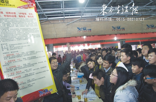 中國江蘇網(wǎng)2月24日訊 招聘方桌連桌,求職者人擠人,廣場內(nèi)寸步難行……這是2月23日上午記者在家樂福地下廣場舉行的2014年我市第15屆招聘會現(xiàn)場看到的一幕。本場招聘會共有近700家企業(yè)參會,提供就業(yè)崗位超過1.5萬個,入場人數(shù)達3萬左右?,F(xiàn)場招聘以民企為主,對于機械制造類、房產(chǎn)家裝類、汽車、醫(yī)療、餐飲業(yè)等崗位的需求量最大,其中新媒體業(yè)的招聘量明顯大于以往,求職人群中以跳槽者居多。