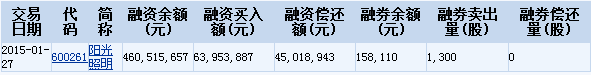 陽(yáng)光照明(600261)2015-01-27融資融券信息顯示,陽(yáng)光照明融資余額460,515,657元,融資買入額63,953,887元,融資償還額45,018,943元,融券余額158,110元,融券賣出量1,300股,融券償還量0股。陽(yáng)光照明融資融券詳細(xì)信息如下表: